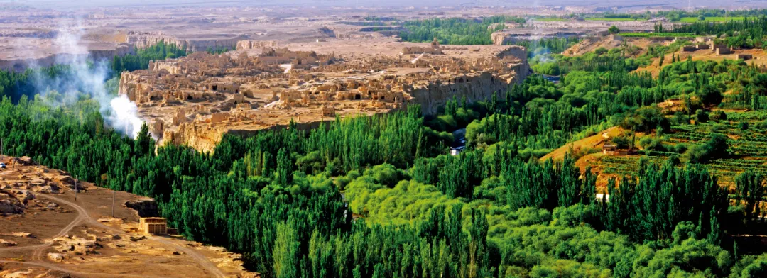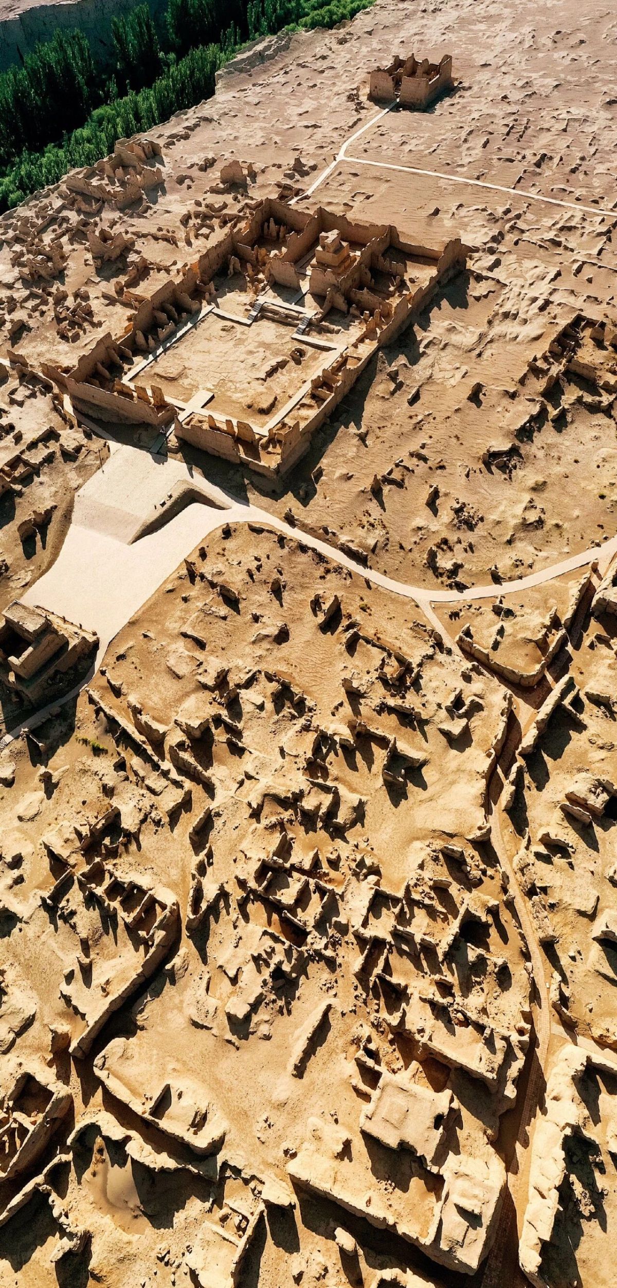 转眼间,灼烤得人目眩的日头逐渐西沉,当暮色降临,炎阳褪去烈焰,化作温柔霞光铺在这片残垣身上,它就摘掉了时光赋予的面纱,露出昔日西域名城的真容。长河落日,大漠孤烟,人世沧桑变化,沙漠和绿洲曾经将自己拆解为无数文明的基因,却始终是静默的旁观者。