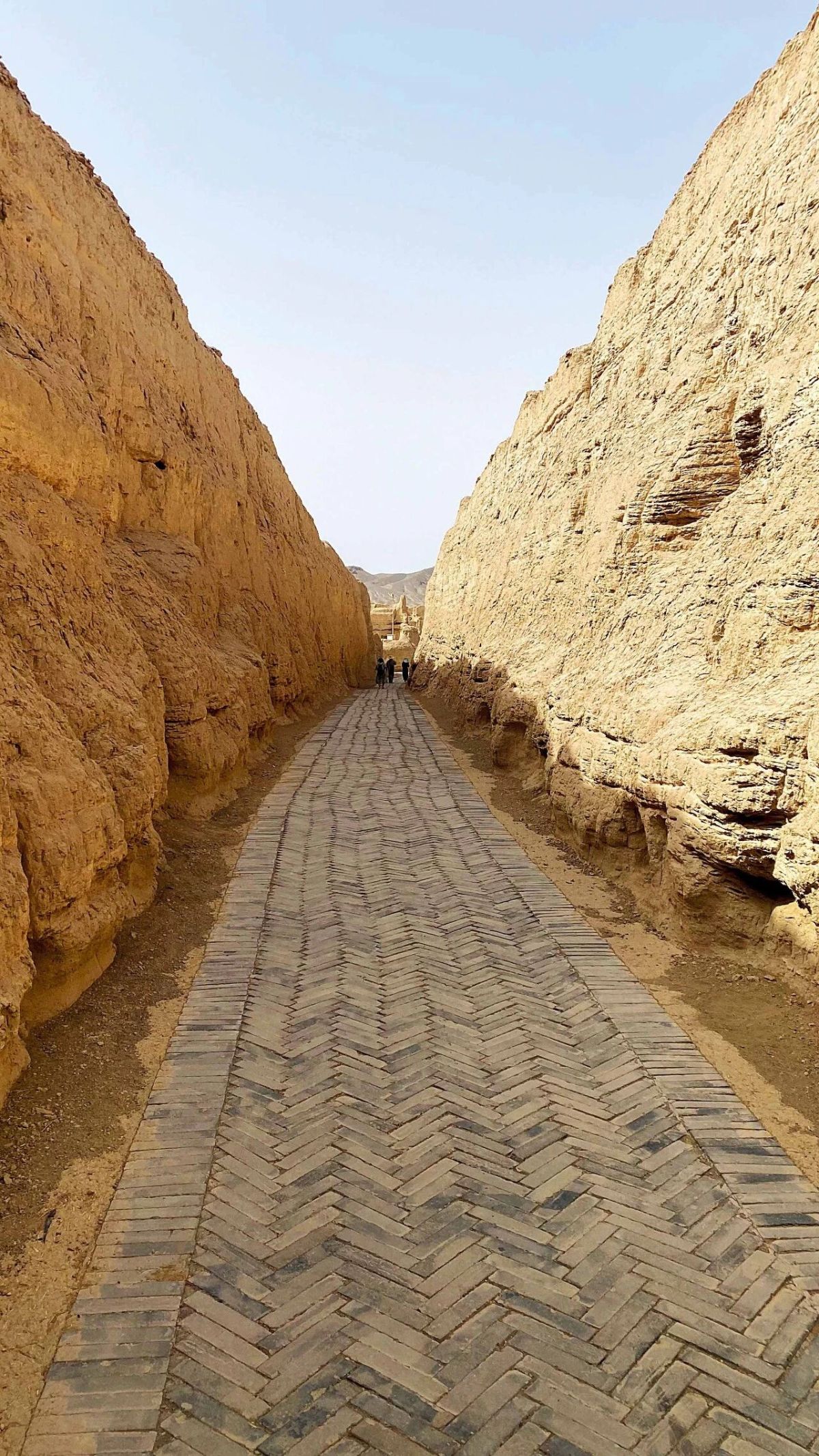 “现在我们就进城了。南城门原来有一个木门,后期因战乱木门被烧毁。”讲解员古丽指着两边城墙上的凹槽说。南门是交河故城的主要出入口,地势险要,有“一人守隘,万夫莫向”的山崖,是当年运送粮草、大军出入的通道。一条宽约10米的笔直中央大路,从南门出发,纵贯全城。