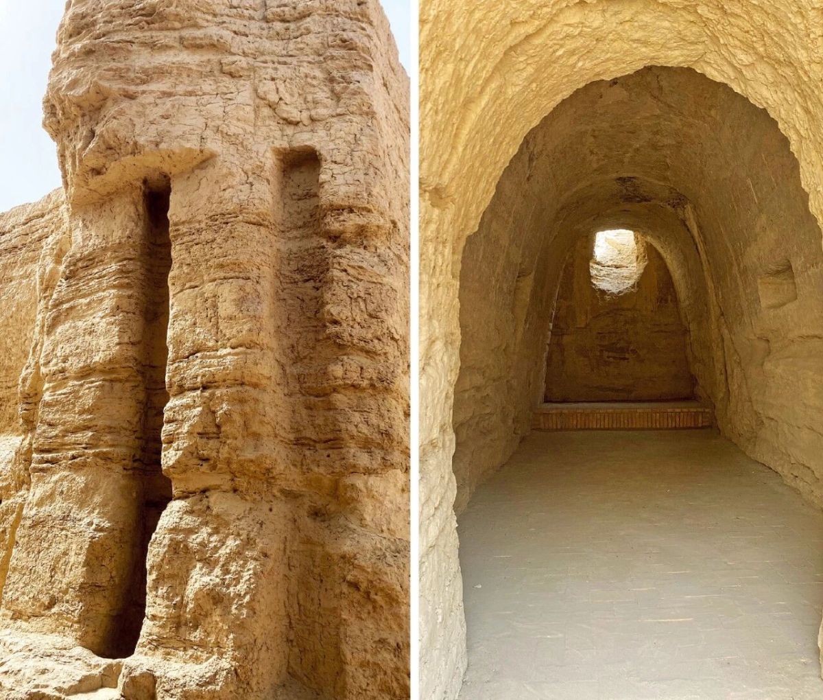 左图:墙上还有三道木门遗留下的凹槽 右图:疑为安西都护府住所的地下宅院 摄影/本刊记者 李静