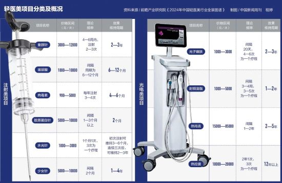 轻医美主要包括注射类和光电类两大类项目,其中玻尿酸是注射类中最畅销的品类。《2025中国轻医美行业现状报告》指出,以玻尿酸、肉毒素为代表的注射类项目,以及热玛吉、光子嫩肤等光电类项目,是轻医美市场增长的主要动力,其中注射类占比最大。