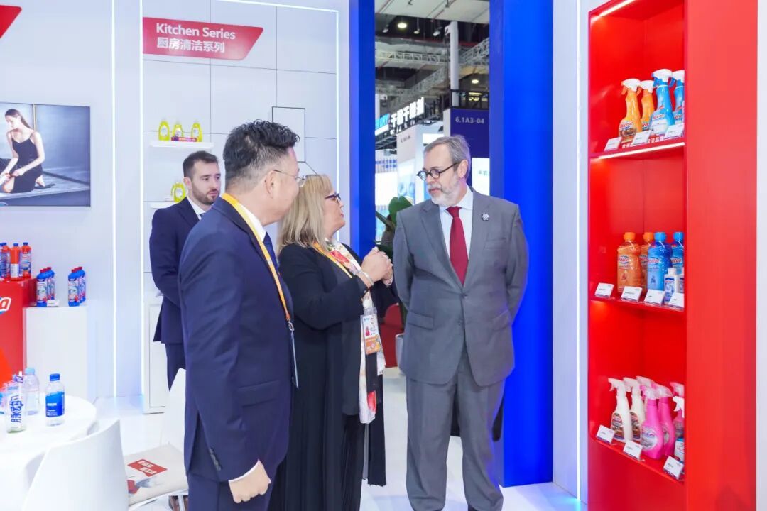 Mootaa茉汰葡萄牙产品研发中心总监安娜女士向大使详细介绍了本次参展的产品与创新亮点。当目光聚焦于绿色天然系列新品时,大使一行表现出浓厚的兴趣。在了解到该系列产品均采用100%纯天然成分时,纳西门托大使对产品表示肯定,并对Mootaa在绿色环保领域所做出的努力与成果给予了高度评价。