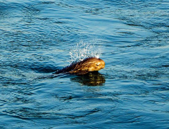 2025年5月1日,湖北宜昌市长江葛洲坝,江豚在水中嬉戏觅食。