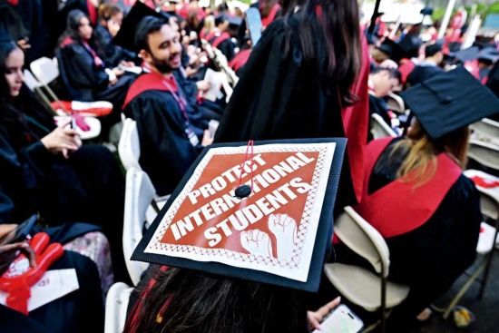 2025年5月29日,美国哈佛大学的毕业典礼上,一些毕业生的学位帽上写着“支持国际学生”的字样。图/视觉中国
