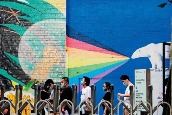 2022年8月1日,位于北京的美国驻华大使馆外,访客排队等候。图/视觉中国