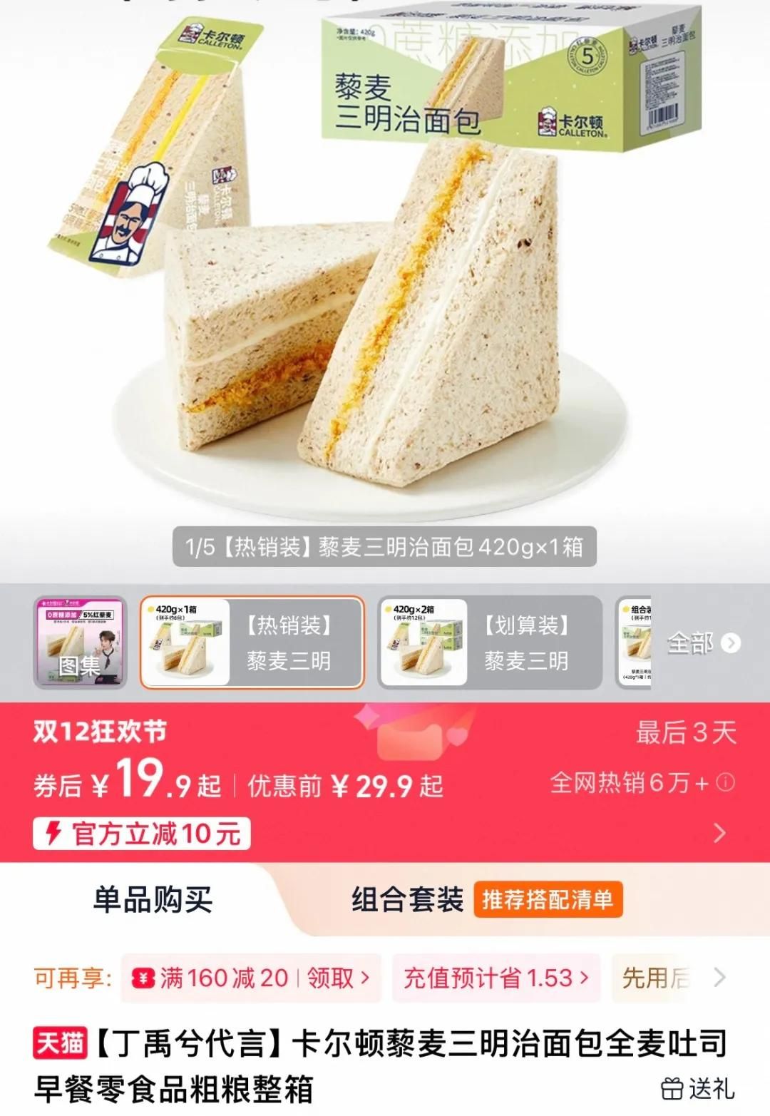有意思报告查询电商平台发现,在卡尔顿天猫官方旗舰店,一箱藜麦三明治(6个装),双12折扣价为19.9元,相当于3.3元/个;咸蛋黄盒子的价格同样如此。这样来看,蜜雪冰城的面包卖2.9元,其实是更便宜了。