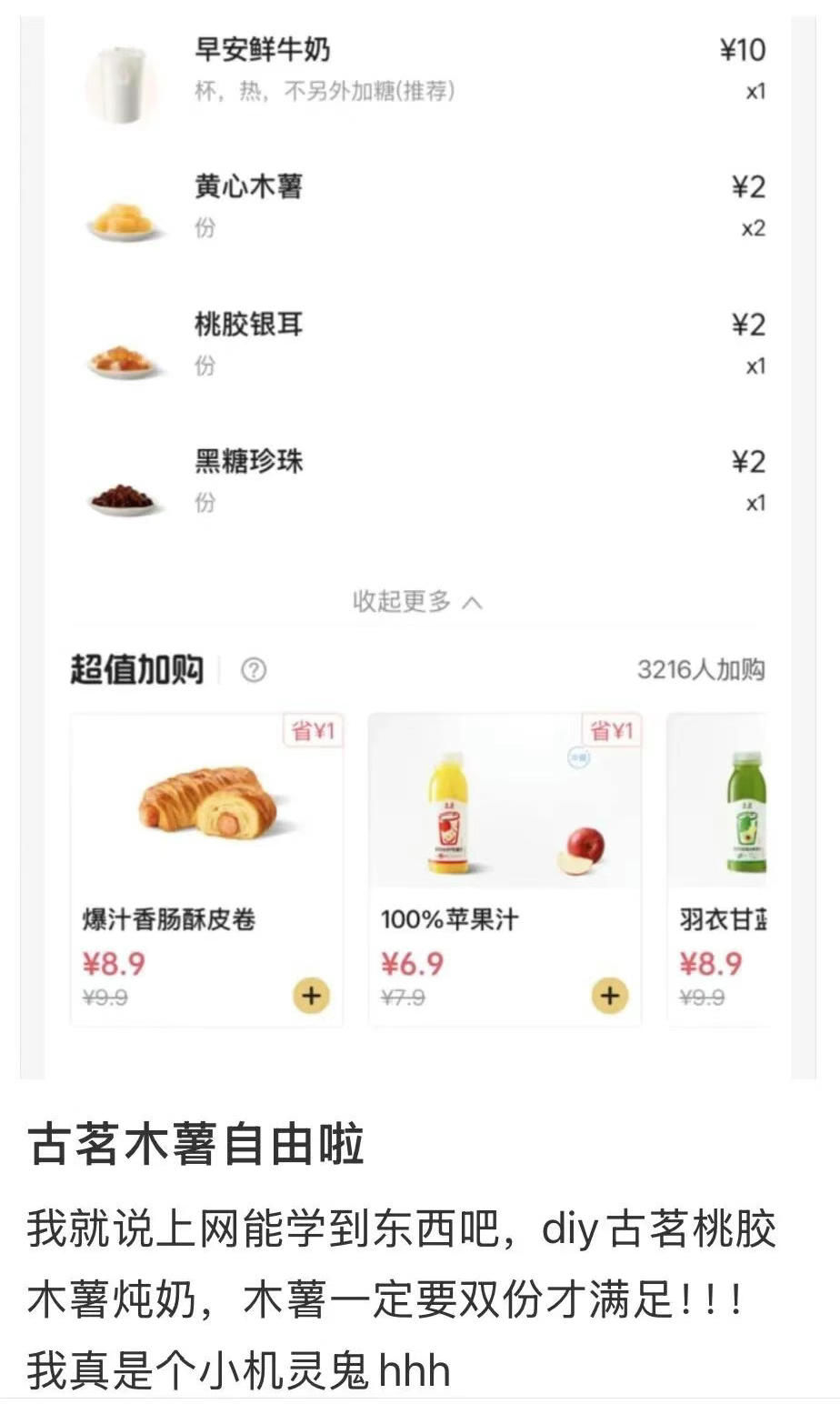 更绝的是,吃货们还开发出点单“神操作”:不直接点炖奶,而是点一份早安鲜牛奶,再单独点6份小料,自行混合。为了吃够吃爽木薯,有人甚至加6份木薯小料。古茗桃胶木薯炖奶爆火后,木薯一度卖到断货。