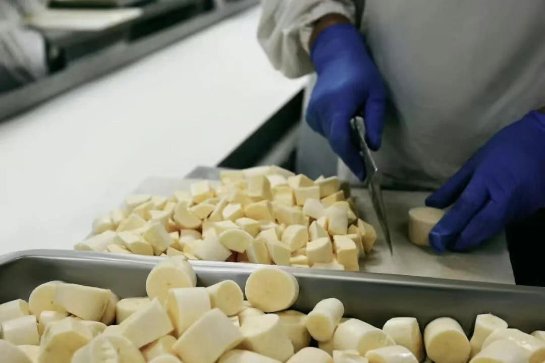 进了工厂,每根木薯都要经历一场“流水线手术”。经过人工初筛后,它们被“掐头去尾”,只保留品质最稳定的中段。随后,清洗、手工去皮、去芯、切块……2500名工人组成的生产线,为的就是保证无论你在全国哪家古茗门店,吃到嘴里的木薯,都是同样味道、同样熟度、同样“哏啾啾”的完美状态。